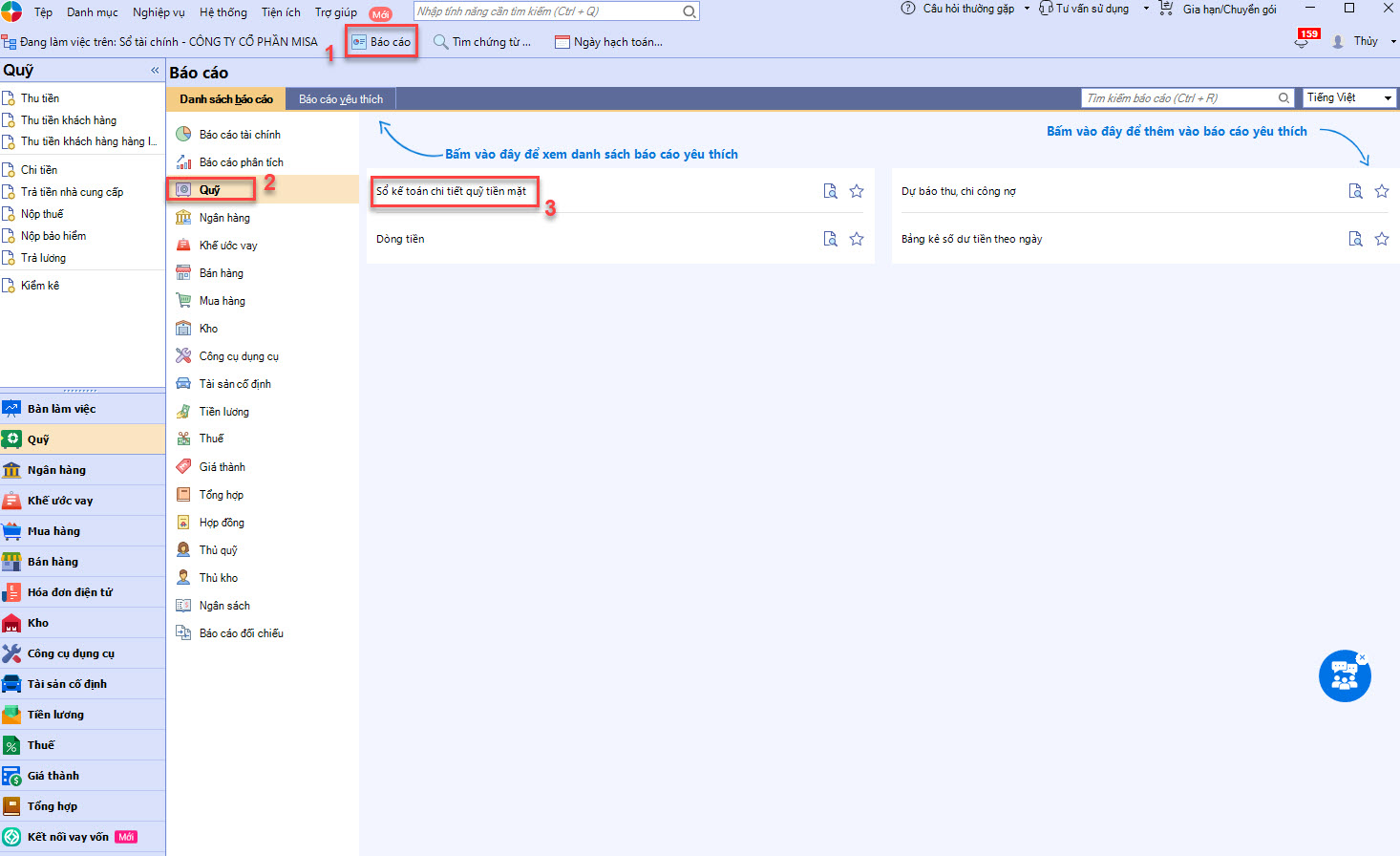 Có thể chọn xem Sổ chi tiết tiền mặt bằng cách vào mục Báo cáo → tab Báo cáo → nhóm báo cáo Quỹ, sau đó nhấn đúp chuột vào báo cáo cần xem.