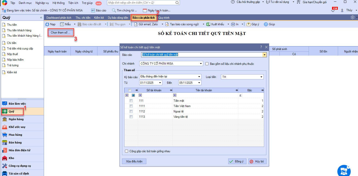 Bước 1: Vào phân hệ Quỹ, chọn tab Báo cáo phân tích, nhấn Chọn tham số