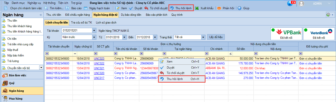 Bước 1. Chọn lệnh chuyển tiền, sau đó nhấn Thu hồi lệnh (hoặc nhấn phải chuột và chọn Thu hồi lệnh).