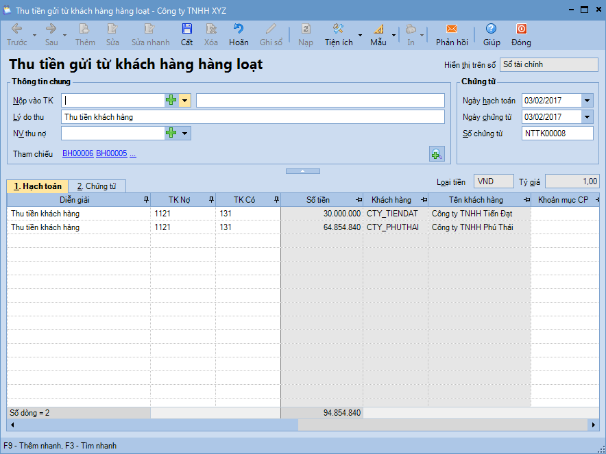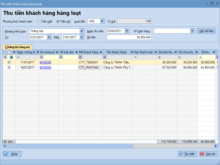 Bước 2: Nhấn Thu tiền => Phần mềm tự động sinh ra chứng từ Thu tiền gửi khách hàng hàng loạt.