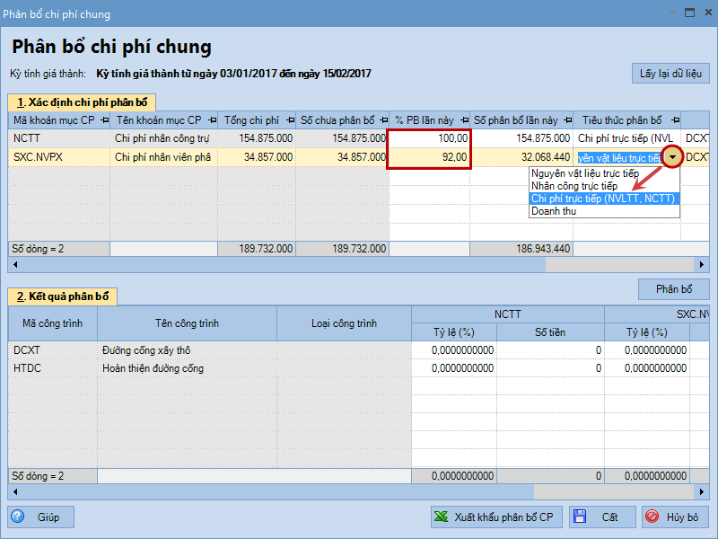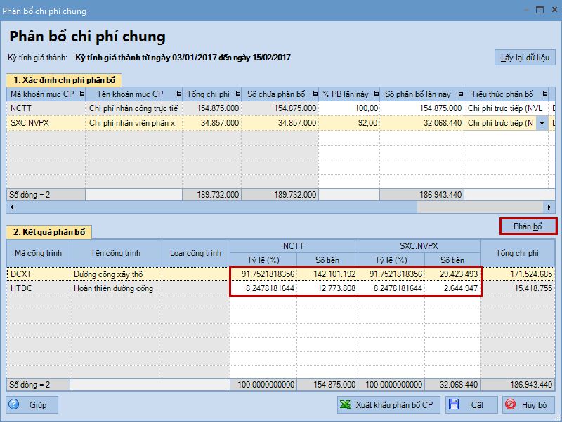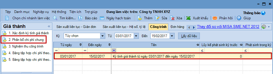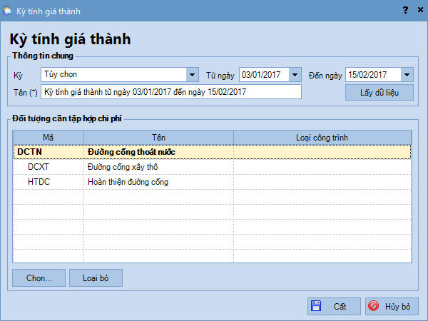 Xem phim hướng dẫn Tải phim hướng dẫn nghiệp vụ Tính giá thành công trình/vụ việc – Bước 5 (TT133) Tại đây (Xem hướng dẫn tải phim) Bước 1: Vào phân hệ Giá thành, tab Công trình, chọn chức năng Thêm. Bước 2: Chọn kỳ tính giá thành và nhấn nút Lấy dữ liệu, phần mềm sẽ tự động lấy lên những công trình/hạng mục công trình cần tính giá thành trong kỳ đã chọn. ![]() Bước 3: Nhấn Cất. Lưu ý: Sử dụng chức năng Chọn/Loại bỏ để chọn bổ sung hoặc xóa các công trình/hạng mục công trình trên danh sách. 2.6 Phân bổ chi phí chung