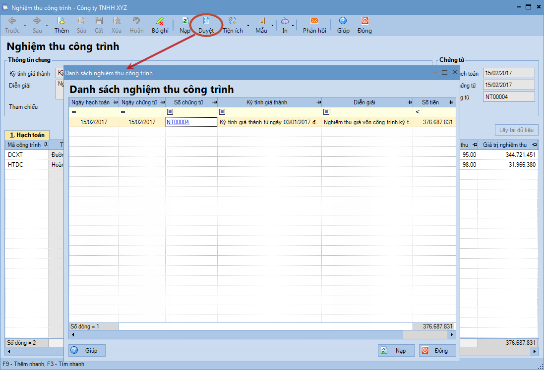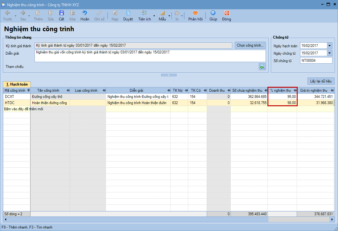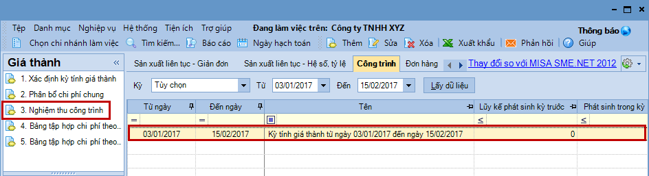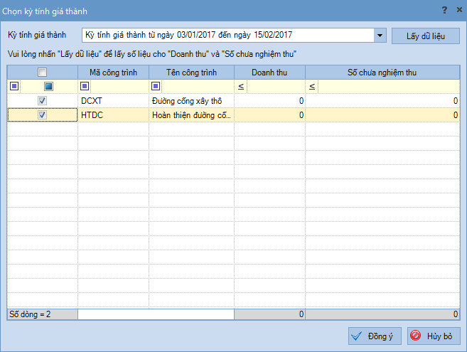 Xem phim hướng dẫn Tải phim hướng dẫn nghiệp vụ Tính giá thành công trình/vụ việc – Bước 7 (TT133) Tại đây (Xem hướng dẫn tải phim) Bước 1: Vào phân hệ Giá thành, tab Công trình. Bước 2: Chọn kỳ tính giá thành trên danh sách và chọn chức năng Nghiệm thu công trình bên thanh tác nghiệp (hoặc nhấn chuột phải, chọn chức năng Nghiệm thu công trình). ![]() Bước 3: Chọn kỳ tính giá thành và tích chọn các công trình/hạng mục công trình cần nghiệm thu. ![]() Lưu ý: Nhấn Lấy dữ liệu để xem được doanh thu đã phát sinh theo từng công trình/hạng mục công trình. Bước 4: Nhấn Đồng ý, hệ thống sẽ tự động tổng hợp chi phí của từ TK 154 để kết chuyển sang TK 632. Bước 5: Nhập kết quả nghiệm thu cho từng công trình/hạng mục công trình. ![]() Bước 6: Nhấn Cất. Lưu ý: