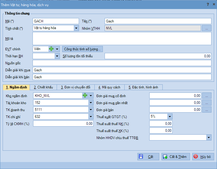 Xem phim hướng dẫn Tải phim hướng dẫn nghiệp vụ Tính giá thành công trình/vụ việc – Bước 1 (TT133) Tại đây (Xem hướng dẫn tải phim) Bước 1: Vào Danh mục\Vật tư hàng hoá\Vật tư hàng hoá, chọn chức năng Thêm. Bước 2: Khai báo nguyên vật liệu. ![]() Bước 3: Nhấn Cất. 2.2 Khai báo công trình/Hạng mục công trình
