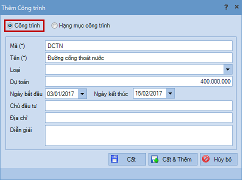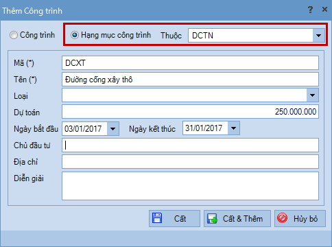 Bước 2: Khai báo các hạng mục thuộc công trình (nếu có):