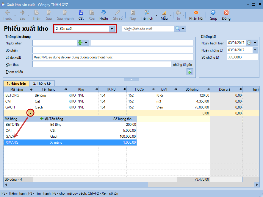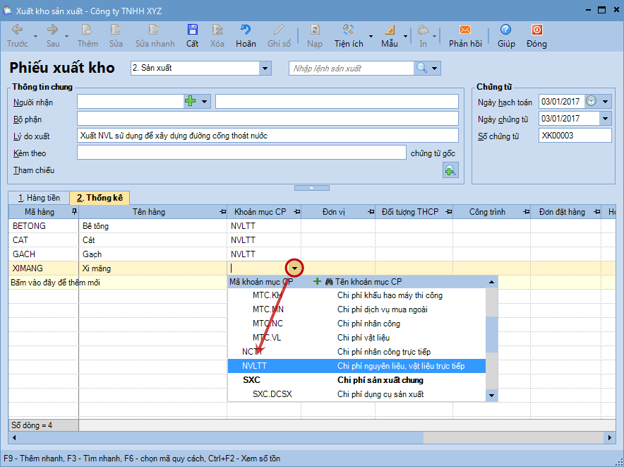 Xem phim hướng dẫn Tải phim hướng dẫn nghiệp vụ Tính giá thành công trình/vụ việc – Bước 3 (TT133) Tại đây (Xem hướng dẫn tải phim) Bước 1: Vào phân hệ Kho, tab Nhập, xuất kho, chọn chức năng Thêm\Xuất kho. Bước 2: Chọn loại chứng từ là Sản xuất. Bước 3: Khai báo nguyên vật liệu được xuất kho để xây dựng công trình. ![]() Bước 4: Chọn thông tin Khoản mục CP và Công trình bên tab Thống kê. ![]() Bước 5: Nhấn Cất. Lưu ý: