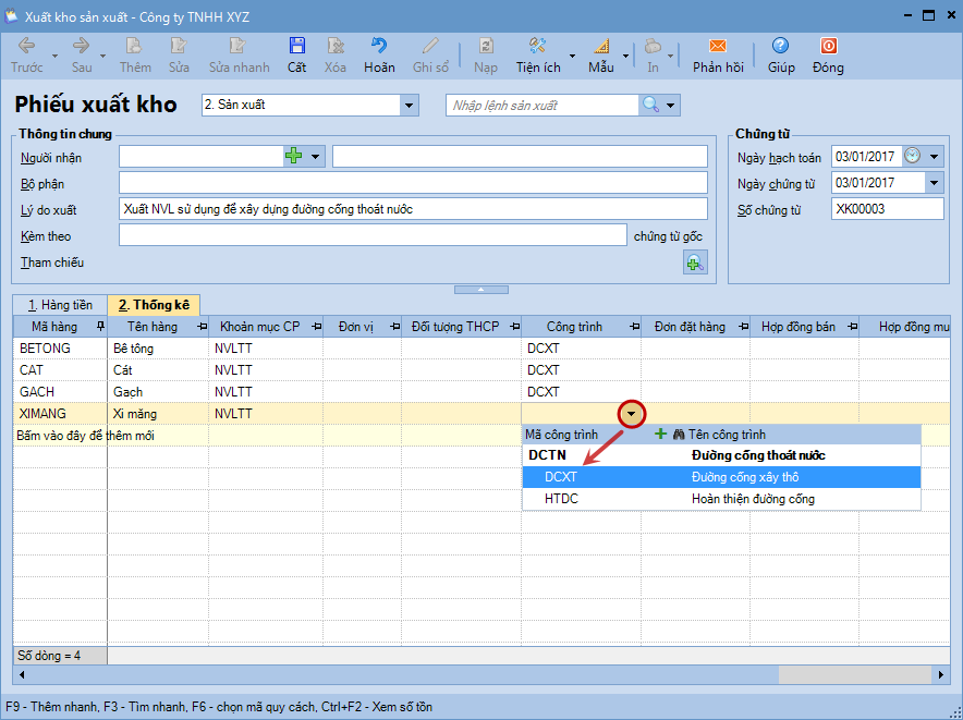 Lưu ý: Trường hợp muốn quản lý các công trình theo từng loại khác nhau, có thể khai báo các loại công trình trên menu Danh mục\Loại công trình. 2.3 Xuất kho nguyên vật liệu