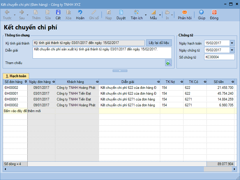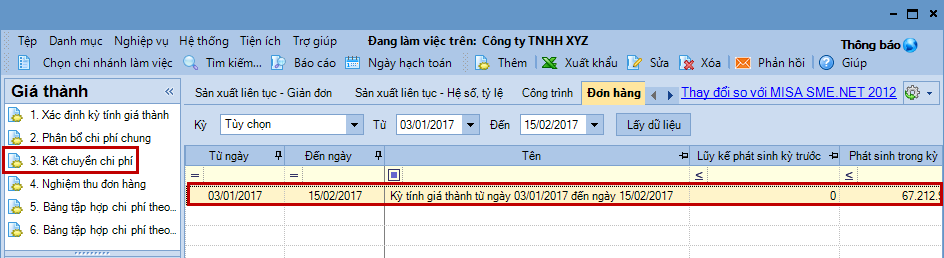 • Hoặc vào menu Nghiệp vụ\Giá thành\Đơn hàng\Kết chuyển chi phí để kiểm tra