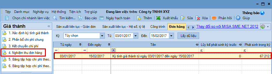 Bước 2: Chọn kỳ tính giá thành trên danh sách và chọn chức năng Nghiệm thu đơn hàng bên thanh tác nghiệp (hoặc nhấn chuột phải, chọn chức năng Nghiệm thu đơn hàng).