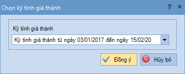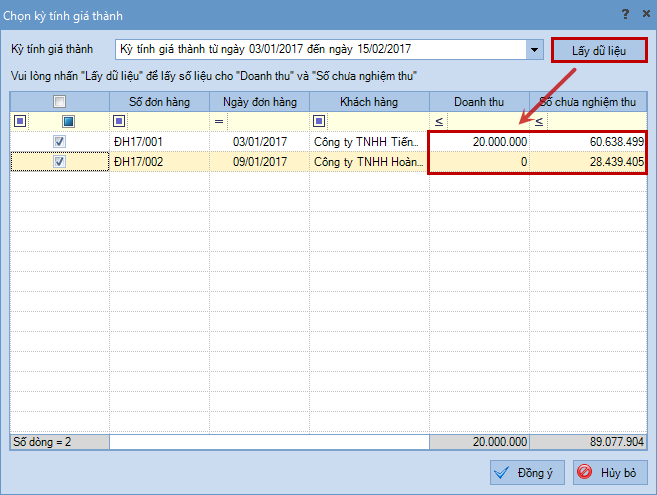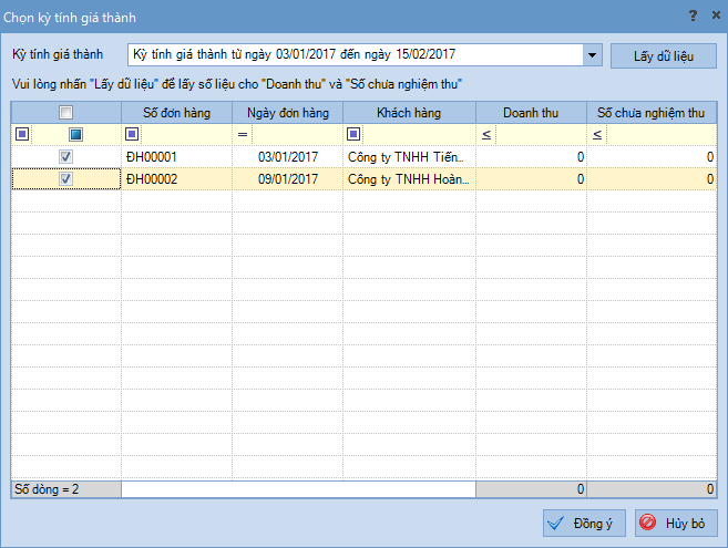 Bước 2: Chọn kỳ tính giá thành và nhấn nút Lấy dữ liệu, phần mềm sẽ tự động lấy lên những đơn hàng cần tính giá thành trong kỳ đã chọn.