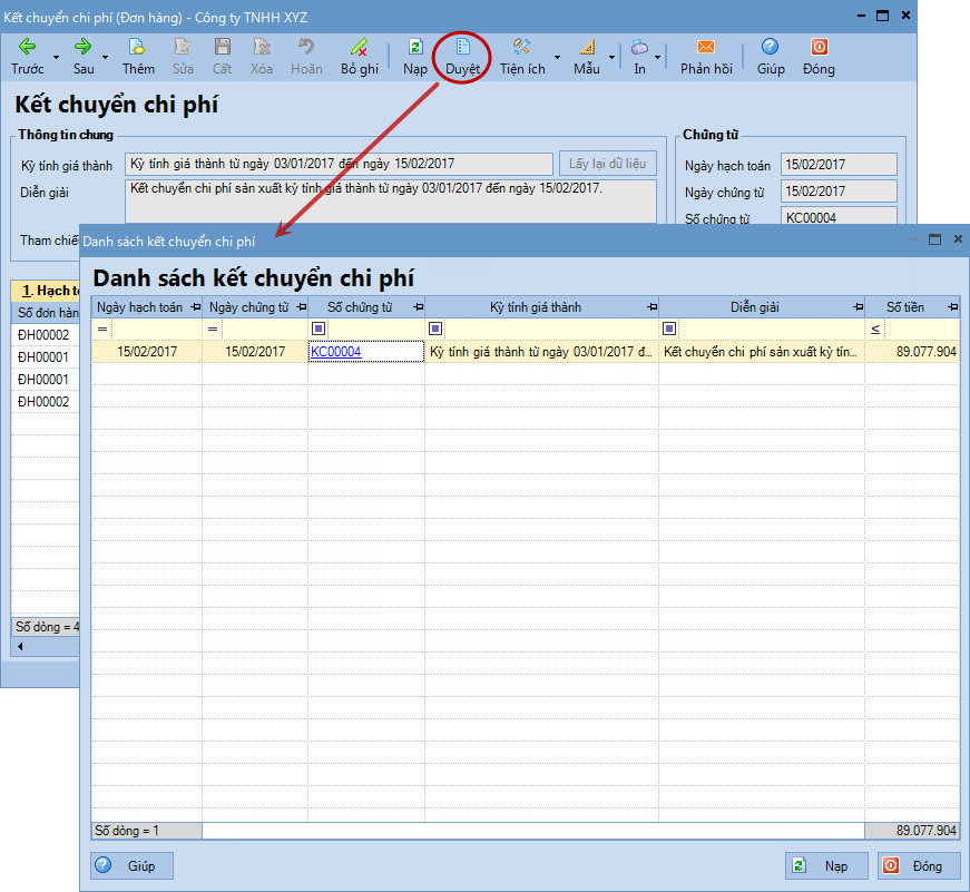 • Chọn chức năng Duyệt trên chứng từ Kết chuyển chi phí.