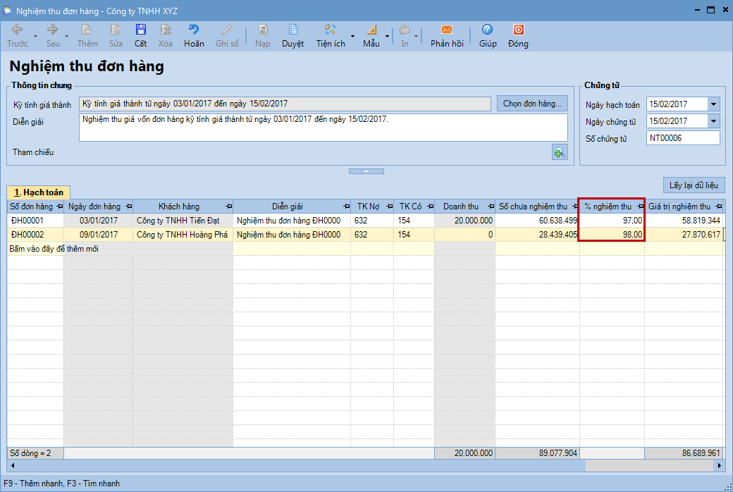 Bước 5: Nhập kết quả nghiệm thu cho từng đơn hàng.