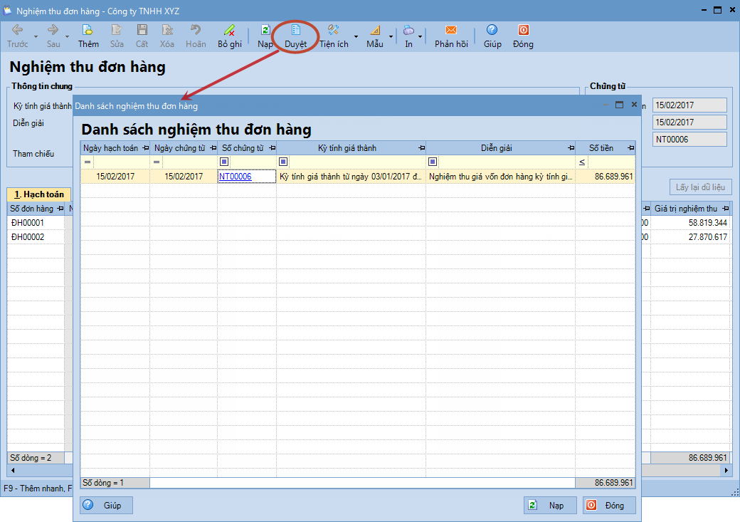 • Trường hợp muốn xem lại các chứng từ nghiệm thu đơn hàng đã lập trước đó, chọn chức năng Duyệt trên chứng từ Nghiệm thu đơn hàng.