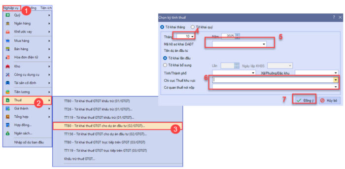 Bước 1: Vào Nghiệp vụ/ Thuế/ Chọn TT80 – Tờ khai thuế GTGT cho dự án đầu tư (02/GTGT)