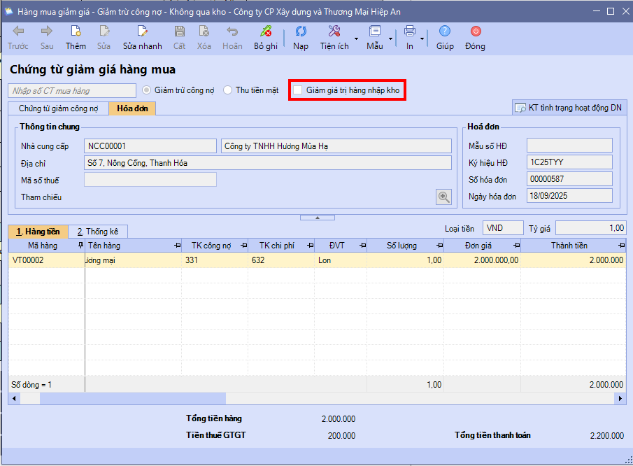 2.1 Hạch toánTrường hợp 1: Nếu thời điểm nhận hoá đơn HÀNG VẪN CÒN TỒNLập chứng từ Giảm giá hàng mua hạch toán Giảm giá trị tồn kho và giảm Tiền thuế GTGT đầu vào. Bước 1: Trên phân hệ Mua hàng\tab Giảm giá hàng mua, chọn chức năng Thêm. Bước 2: Tích chọn Giảm giá trị hàng nhập kho Bước 3: Khai báo thông tin chứng từ:
