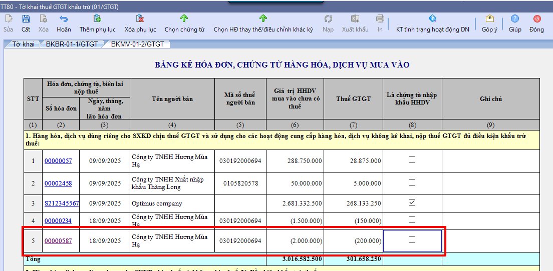 2.2 Kê khaiKhi nhận được Hóa đơn chiết khấu thương mại thì Người mua kê khai vào kỳ nhận được hóa đơn điều chỉnh. Khi lập tờ khai thuế của kỳ lập hóa đơn chiết khấu thương mại, hóa đơn sẽ tự động lên bảng kê. Ví dụ: Ngày 18/09/2025, đơn vị nhận được hóa đơn tiền chiết khấu thương mại tháng 8 số 00000587. Hóa đơn này sẽ được kê khai lên tờ khai tháng 9/2025 hoặc tờ khai quý III/2025