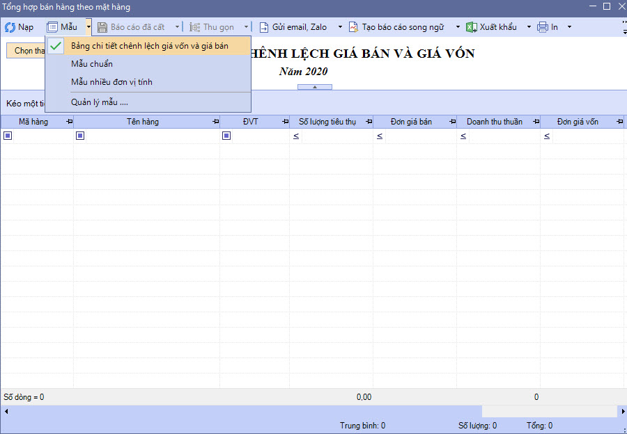 Bước 3: Nhấn vào biểu tương ⏷ cạnh chữ Mẫu và chọn Bảng chi tiết chênh lệch giá vốn và giá bán