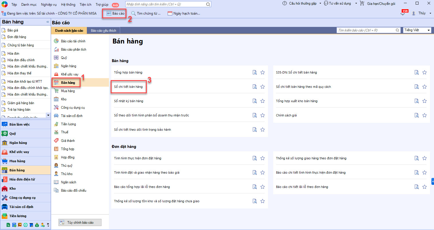 Bước 1: Vào Báo cáo\Danh sách báo cáo\Bán hàng\Sổ chi tiết bán hàng