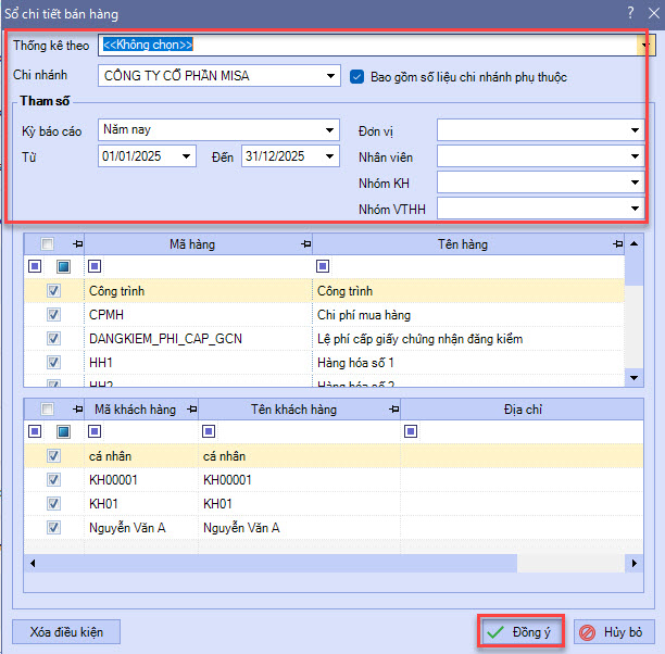 Bước 2: Chọn tham số báo cáo Thống kê theo Không chọn\ Kỳ báo cáo\ Mã hàngMã khách hàng muốn xem\ nhấn Đồng ý