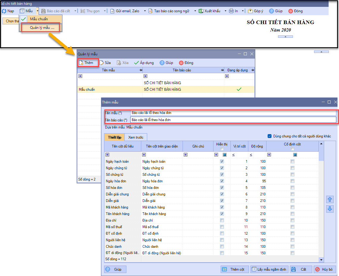 Bước 3: Nhấn vào biểu tượng⏷ cạnh chữ Mẫu\ Quản lý mẫu\ Thêm để tạo mẫu mới, đặt tên mẫu là Báo cáo lãi lỗ theo hóa đơn,  tích hiển thị cột Đơn giá, Đơn giá vốn , Doanh số bán và Giá vốn