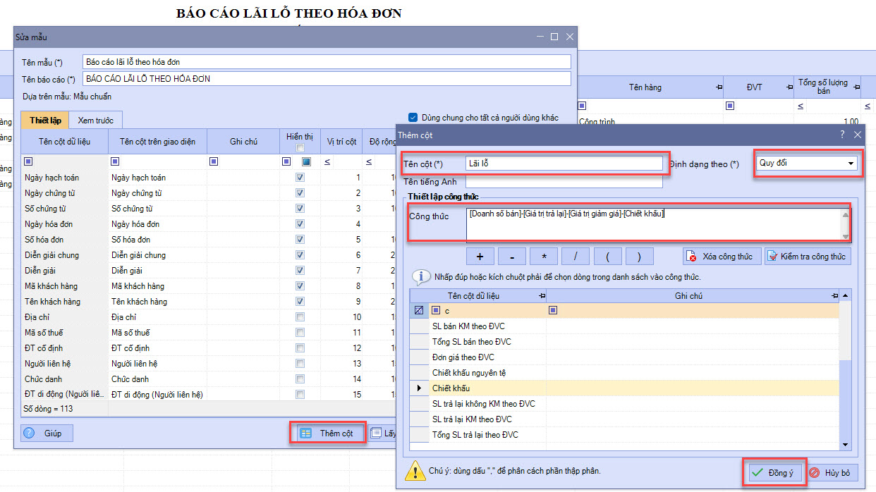 Bước 4: Nhấn Thêm cột để tạo cột Lãi lỗ và thiết lập công thức cho cột : Lãi lỗ =  Doanh số bán – Gía trị trả lại – Giá trị giảm giá – Chiết khấu