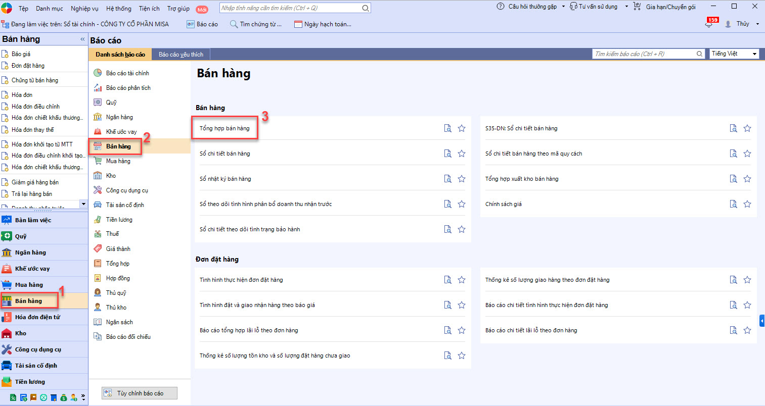 Bước 1: Vào Báo cáo\Danh sách báo cáo\Bán hàng\Tổng hợp bán hàng.