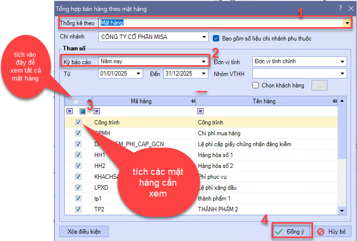 Bước 2:  Chọn tham số Thống kê theo mặt hàng\ Chọn Kỳ báo cáo\ Chọn các mã hàng cần xem\ nhấn Đồng ý