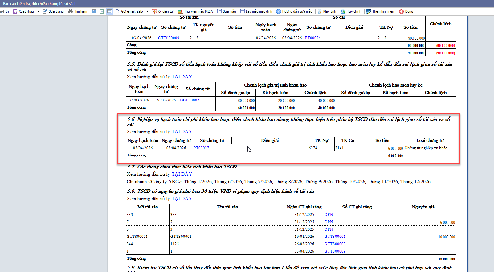 Bước 2: Kiểm tra mục5.6. Nghiệp vụ hạch toán chi phí khấu hao hoặc điều chỉnh khấu hao nhưng không thực hiện trên phân hệ TSCĐ dẫn đến sai lệch giữa sổ tài sản và sổ cái
