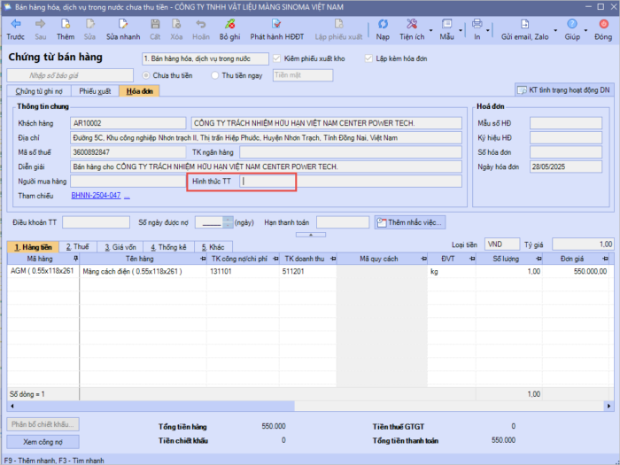• Trên Hóa đơn để trống hình thức thanh toán: