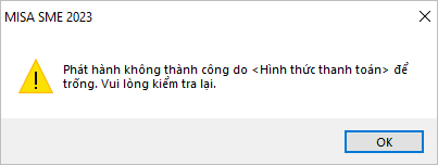 • Khi phát hành hóa đơn, chương trình hiển thị cảnh báo “Phát hành không thành công do <Hình thức thanh toán> để trống. Vui lòng kiểm tra lại” => Người dùng cần bổ sung thông tin Hình thức thanh toán thì mới có thể phát hành hóa đơn: