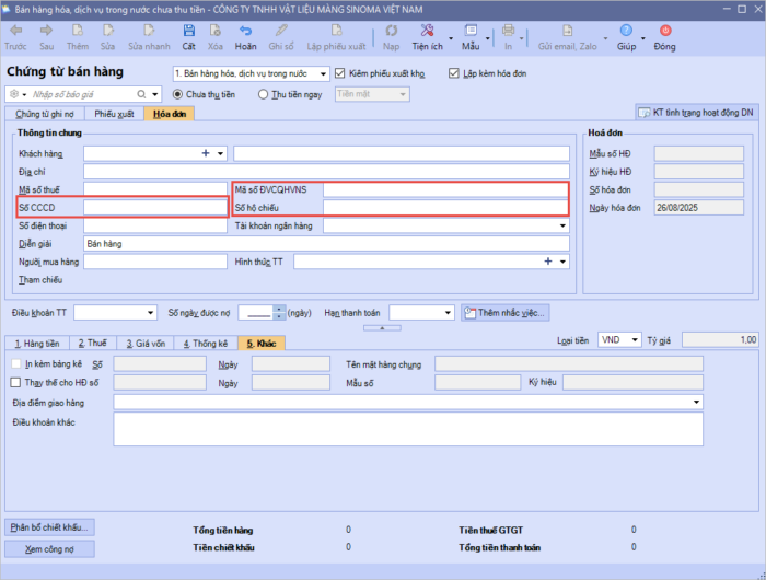 3. Sửa mẫu hóa đơn thêm Căn cước công dân, MSĐVCQHVNS, Số hộ chiếu...