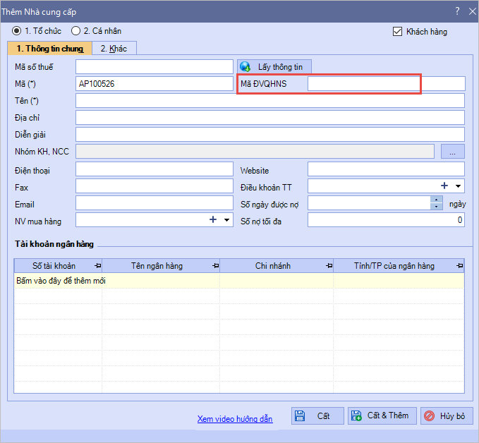 - Đối với đối tượng là Tổ chức: Bổ sung thông tin Mã số ĐVQHNS