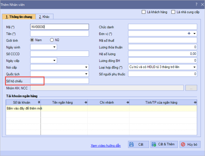 - Từ MISA SME 2023 R35, trên giao diện chi tiết danh mục Nhân viên đã bổ sung thông tin Số hộ chiếu.