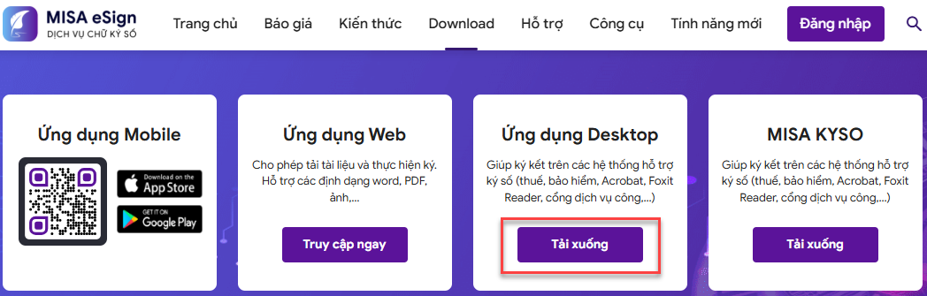 2.2 Nộp tờ khai bằng cách nộp XML báo lỗiVí dụ: Nộp tờ khai báo lỗi “Chữ ký điện tử trên tờ khai không hợp lệ” Bước 1: Thực hiện xóa file XML vừa nộp trên Cổng dịch vụ công bị lỗi, xuất khẩu lại file XML mới, không dùng file vừa ký nộp trên Cổng dịch vụ công để nộp lại Bước 2: Tải ứng dụng Esign desktop (Áp dụng với loại CKS từ xa – nếu dùng CKS là token thì bỏ qua bước này) tại link https://esign.misa.vn/download/