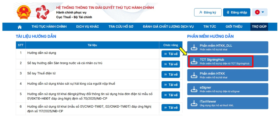 2.1. Chưa cài hoặc bật Plugin ký sốĐể sửa lỗi chưa cài đặt Plugin ký số trên Cổng dịch vụ công Thuế, thực hiện theo các bước sau: Bước 1: Truy cập Hệ thống thông tin giải quyết thủ tục hành chính theo địa chỉ: Bước 2: Trên thanh menu chọn tab Trợ giúp, chọn phần mềm hỗ trợ ký điện tử TCT SingingHub để tải về máy
