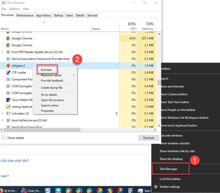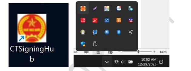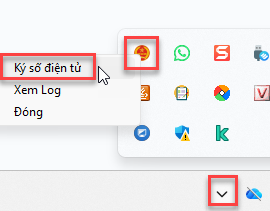Bước 5: Tại góc phải cuối màn hình bấm mũi tên chỉ lên/ nháy chuột phải vào phần mềm ký số của thuế vừa tải về/ Chọn Ký số điện tử