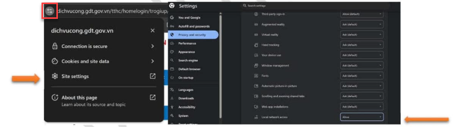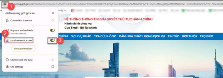 Bước 8: Truy cập lại vào trang dichvucong.gdt.gov.vn nộp thuế/ vào web trình duyệt ở góc trái phía trên link trang đường dẫn, tại dòng Local network acess (Quyền riêng tư và bảo mật) tích biểu tượng cho phép