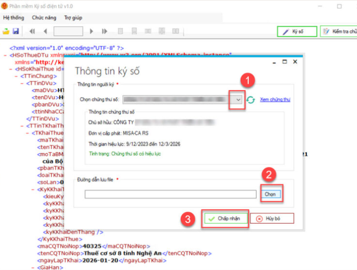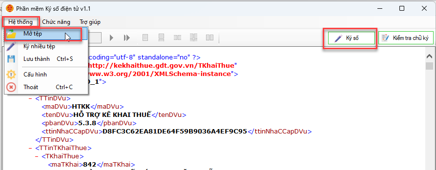 Bước 6: Tại giao diện phần mềm ký số vào Hệ thống, chọn Mở tệp, chọn file XML cần ký số/ Nhấn Ký số