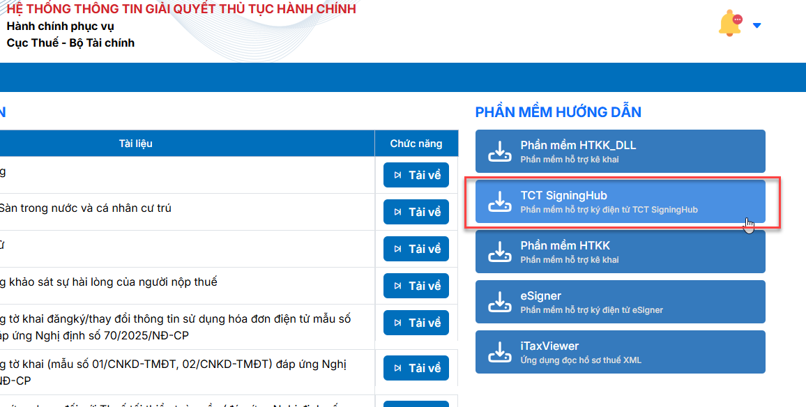 Bước 3: Truy cập Hệ thống thông tin giải quyết thủ tục hành chính theo địa chỉ: https://dichvucong.gdt.gov.vn/tthc/homelogin/trogiup/views Bước 4: Trên thanh menu chọn tab Trợ giúp, chọn phần mềm hỗ trợ ký điện tử TCT SingingHub để tải về máy/ Giải nén và nhấp đúp vào file vừa tải về (CTSigningHub) để Cài đặt công cụ ký số