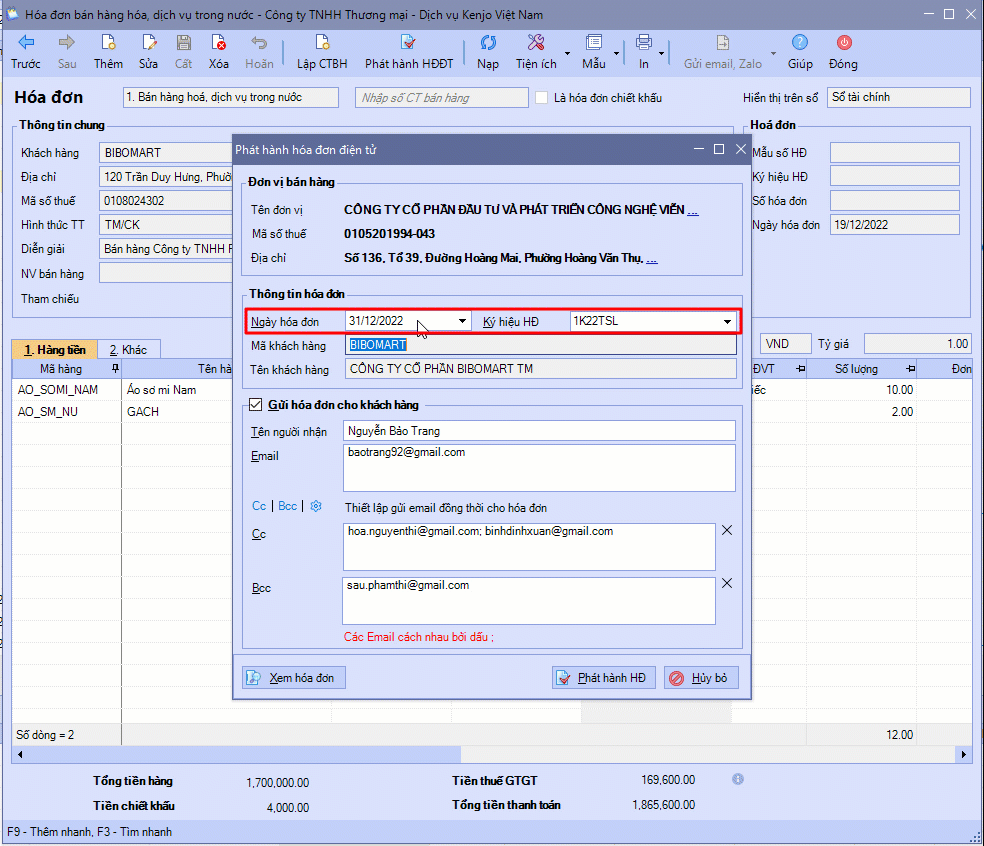 Lưu ý: Nếu người dùng tự sửa ngày tháng năm khi phát hành hóa đơn, chương trình sẽ tự động chuyển lại ký hiệu và số hóa đơn theo đúng thời điểm ngày người dùng sửa.