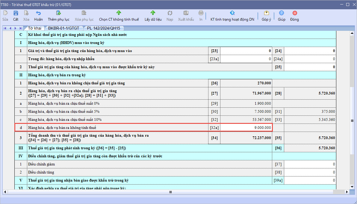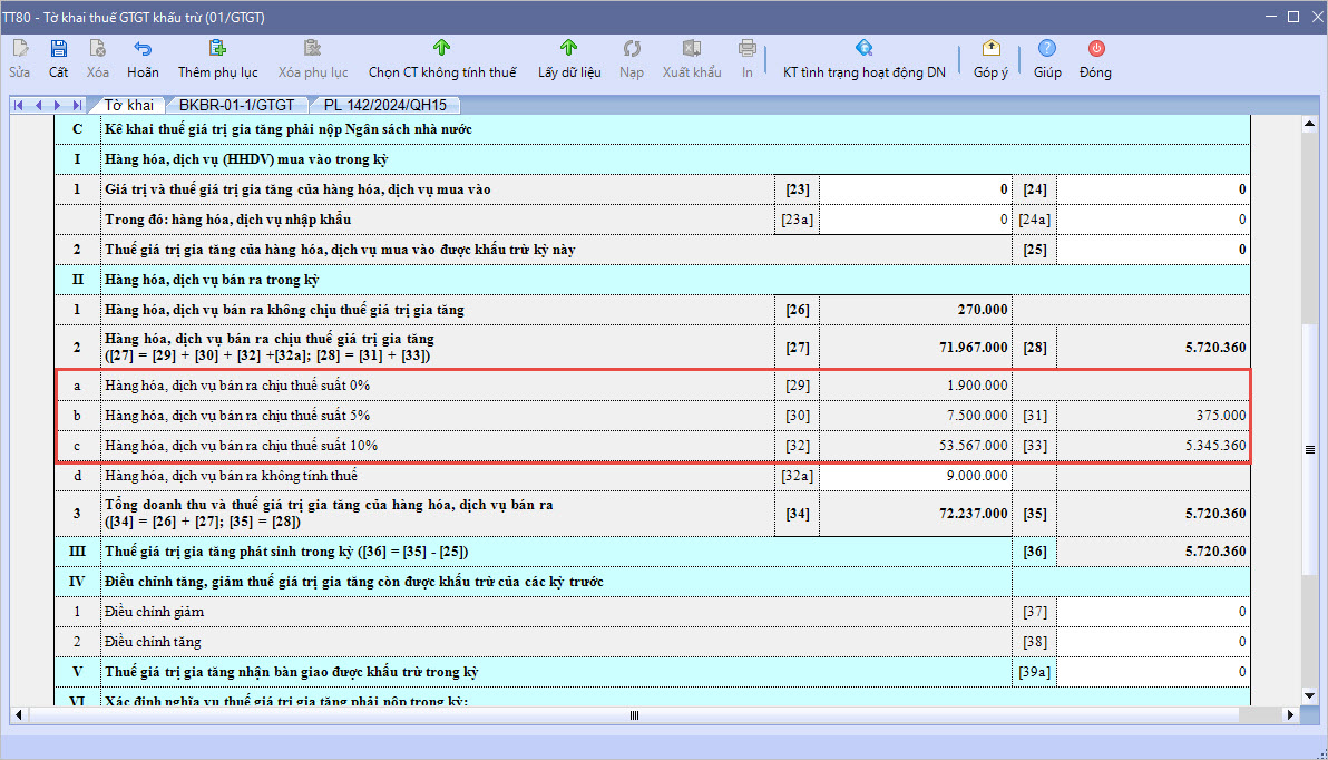2.2 Nguyên tắc lấy số liệu HHDV bán ra lên tờ khai thuế GTGTSố liệu nhóm II. Hàng hóa, dịch vụ (HHDV) bán ra trong kỳ trên tờ khai thuế GTGT sẽ được lấy từ phụ lục BKBR-01-1/GTGT và phân loại theo % Thuế GTGT nhập tương ứng trên hóa đơn, chứng từ bán hàng. Cụ thể: