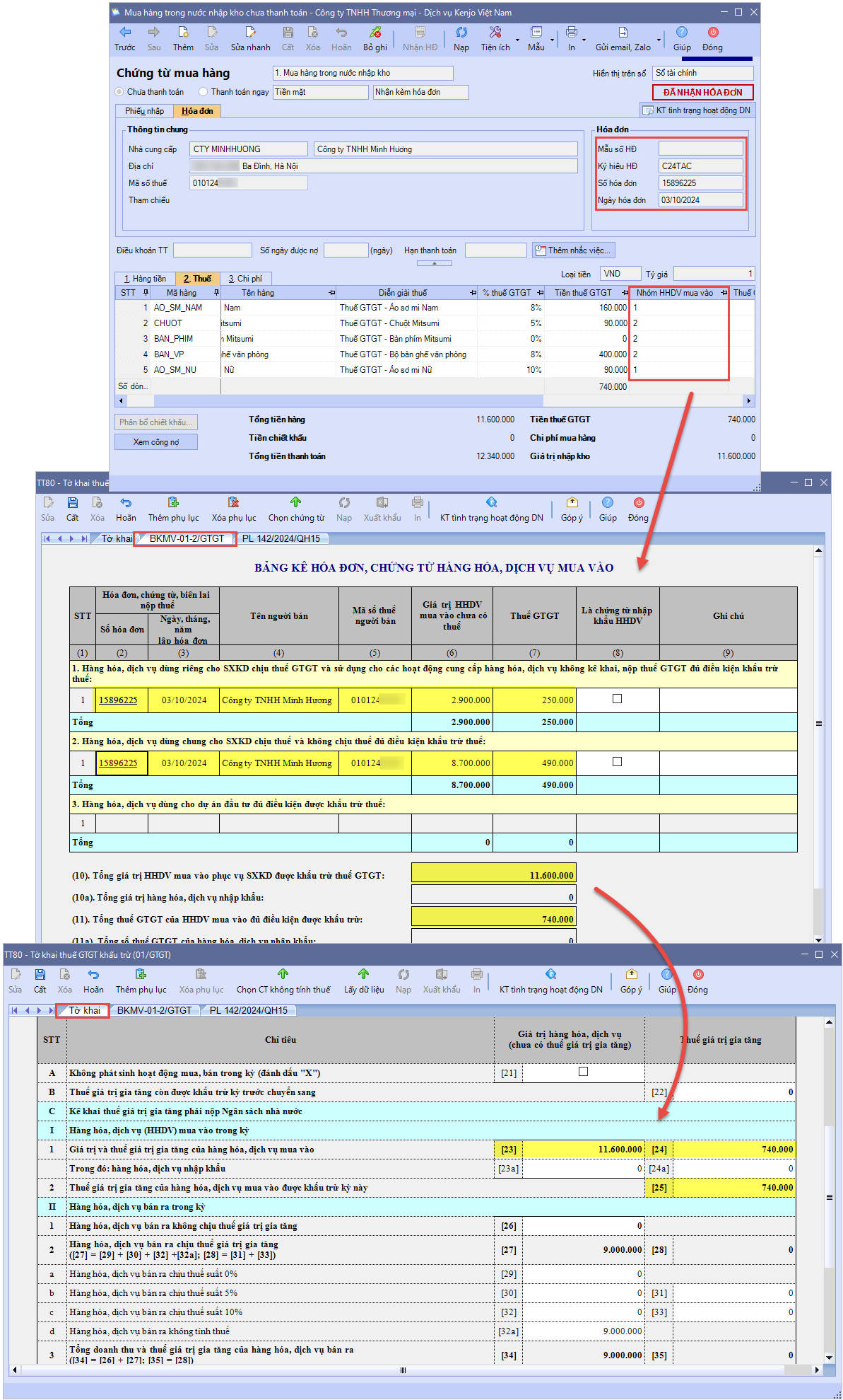 2.1 Nguyên tắc lấy số liệu HHDV mua vào lên tờ khai thuế GTGTSố liệu nhóm I. Hàng hóa, dịch vụ (HHDV) mua vào trong kỳ trên tờ khai thuế GTGT sẽ được lấy từ phụ lục BKMV-01-2/GTGT và phân loại theo mục Nhóm HHDV mua vào tương ứng trên hóa đơn, chứng từ mua hàng. Cụ thể: