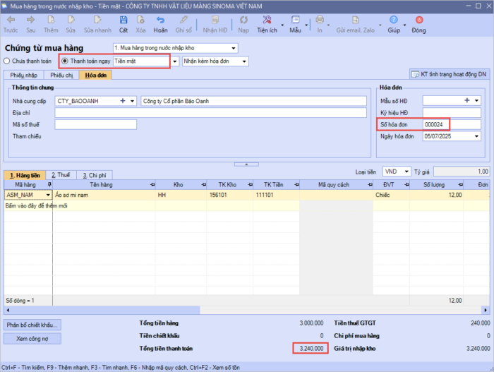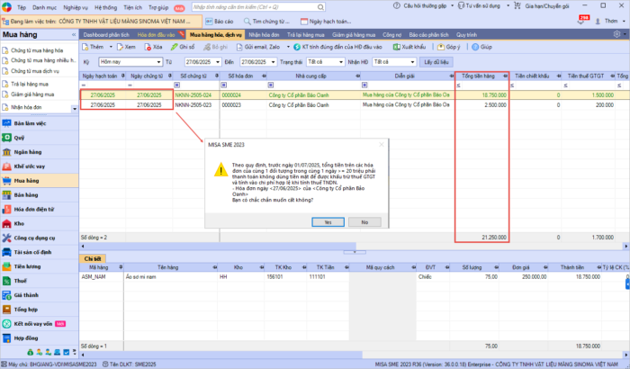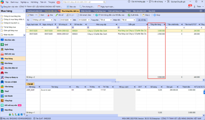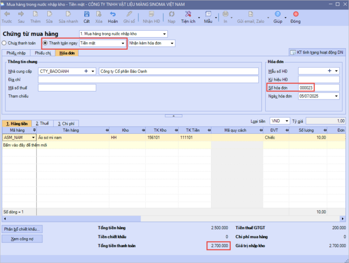 • Ngày 05/07/2025, đơn vị có 2 hóa đơn mua hàng số 023, 024 của cùng 1 nhà cung cấp là Công ty Cổ phần Bảo Oanh; và đơn vị đều thực hiện thanh toán bằng tiền mặt: