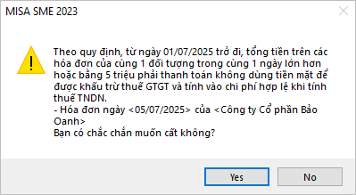 • Do đó, đối với hóa đơn số 024, khi người dùng lập hóa đơn và thực hiện cất chứng từ; chương trình sẽ tự động đưa ra cảnh báo: “Theo quy định, từ ngày 01/07/2025 trở đi, tổng tiền trên các hóa đơn của cùng 1 đối tượng trong cùng 1 ngày lớn hơn hoặc bằng 5 triệu phải thanh toán không dùng tiền mặt để được khấu trừ thuế GTGT và tính vào chi phí hợp lệ khi tính thuế TNDN”: