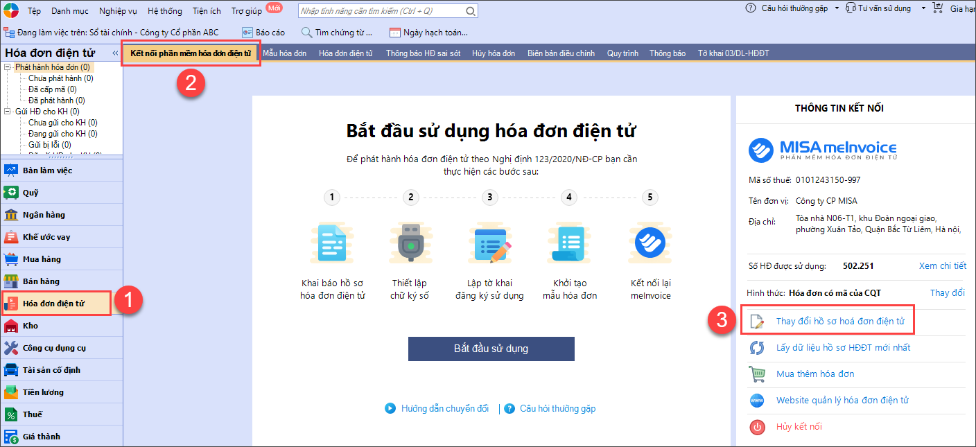 2.1 Lập Tờ khai thay đổi thông tin sử dụng hóa đơn điện tử (Mẫu 01/ĐKTĐ- HĐĐT) gửi Cơ quan ThuếBước 1: Trên phần mềm MISA SME: Vào phân hệ Hóa đơn điện tử \ tab Kết nối phần mềm hóa đơn điện tử Bước 2: Nhấn mục Thay đổi hồ sơ hóa đơn điện tử ==> phần mềm sẽ chuyển hướng lên meInvoice web
