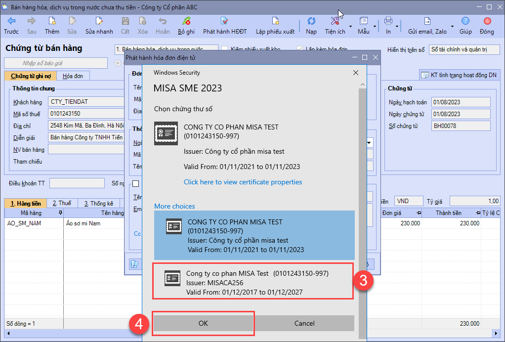 - Cập nhật và chọn Chứng thư số mới trên phần mềm khi phát hành hóa đơn