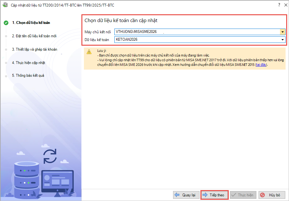 Lưu ý: 1. Hệ thống không cho phép cập nhật nếu phiên bản phần mềm đang sử dụng nhỏ hơn phiên bản của dữ liệu. Vì vậy, người dùng cần cập nhật phần mềm lên phiên bản bằng hoặc cao hơn phiên bản của dữ liệu. (Ví dụ: Phần mềm đang sử dụng là phiên bản MISA SME 2026 R1, trong khi dữ liệu kế toán cần cập nhật là MISA SME 2026 R2 => Cần cập nhật phần mềm lên SME2026 R2) 2. Hệ thống chỉ cho phép cập nhật các dữ liệu được lưu trên các máy chủ SQL của chính máy tính đang làm việc.. 3. Hệ thống chỉ hỗ trợ cập nhật đối với các dữ liệu theo TT200. Với các dữ liệu khác TT200, hệ thống sẽ đưa ra cảnh báo sau khi chuyển sang bước tiếp theo.