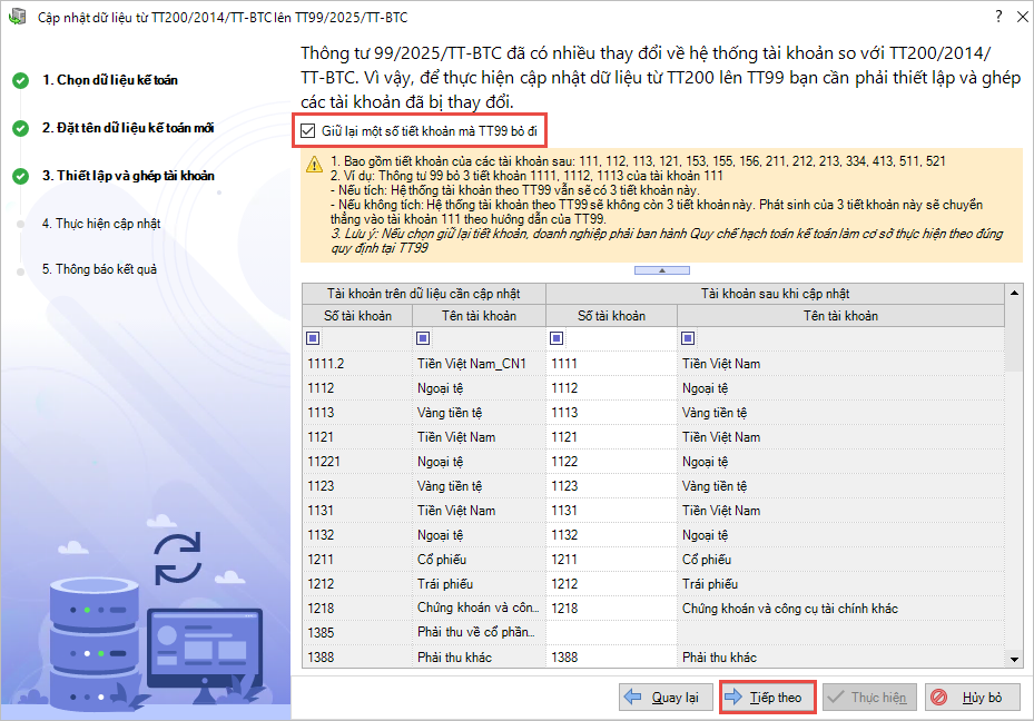 Bước 3: Thiết lập và ghép tài khoảnChương trình đã tự động ghép các Tài khoản hạch toán của TT200 với các Tài khoản hạch toán của TT99. Tuy nhiên, kế toán vẫn có thể ghép lại cho phù hợp với nhu cầu quản lý tại doanh nghiệp mình.