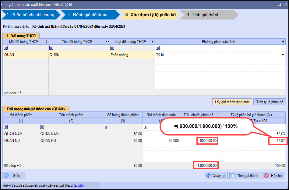 Ví dụ ở đây: Tỷ lệ phân bổ giá thành QUẦN NỮ = Tiêu chuẩn phân bổ (QUẦN NỮ) / Tổng tiêu chuẩn phân bổ = (900.000/1.900.000) *100% = 47,37%
