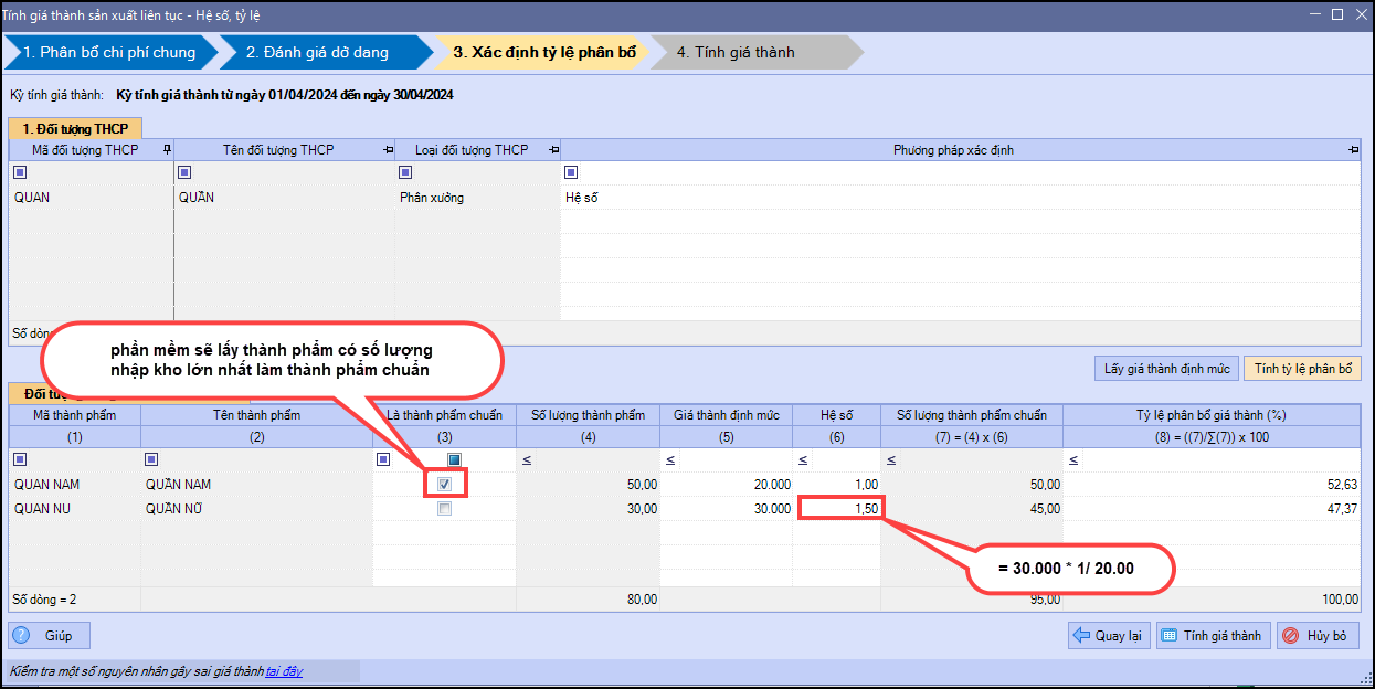 Ví dụ: để tính hệ số của thành phẩm QUẦN NỮ = Giá thành định mức (QUẦN NỮ) x Hệ số (QUẦN NAM) / Giá thành định mức (QUẦN NAM) = 30.000 * 1/20.000=1,5