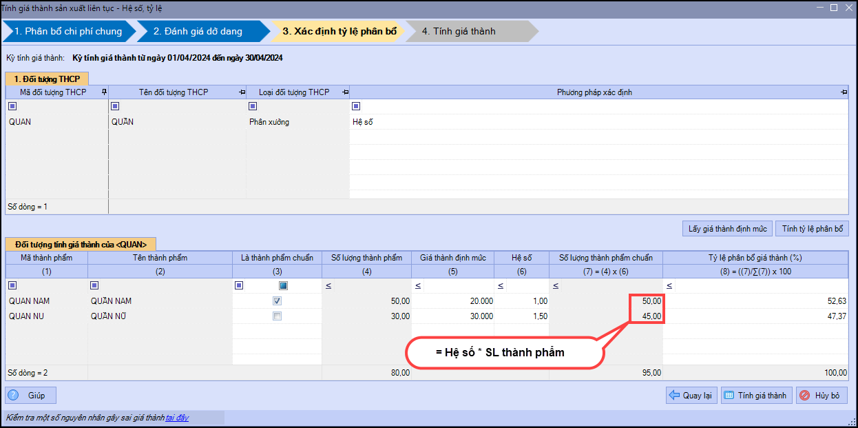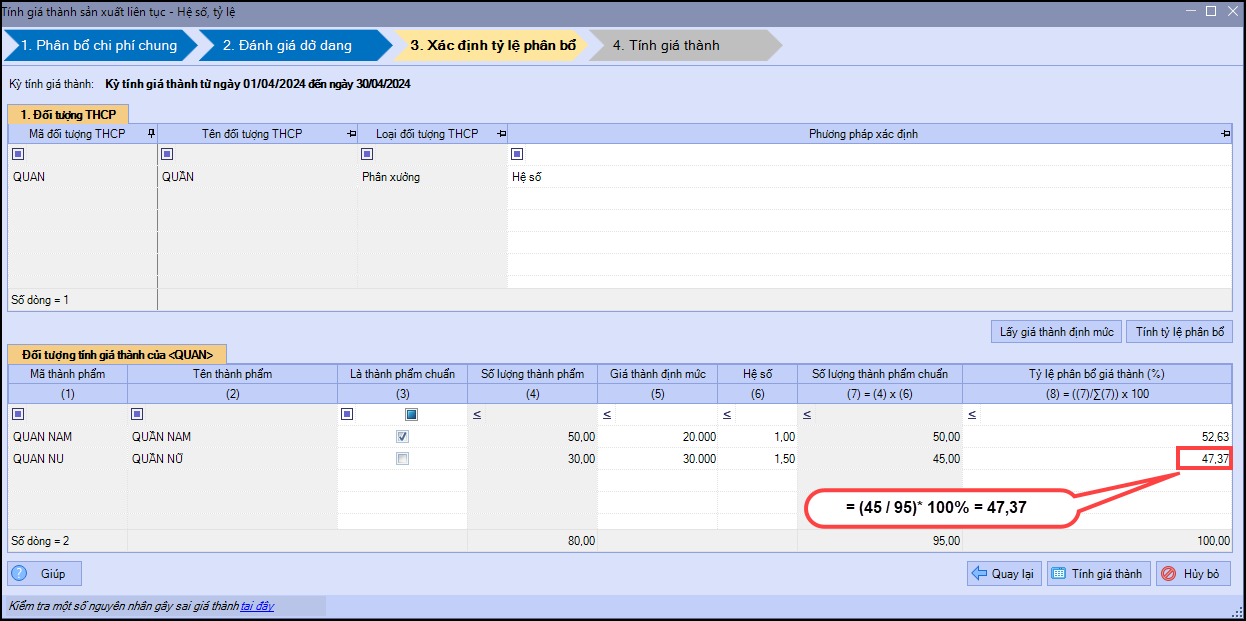Ví dụ ở đây: Tỷ lệ phân bổ giá thành QUẦN NỮ = SL thành phẩm chuẩn (QUẦN NỮ) / Tổng SL thành phẩm chuẩn = (45/95)*100% = 47,37%